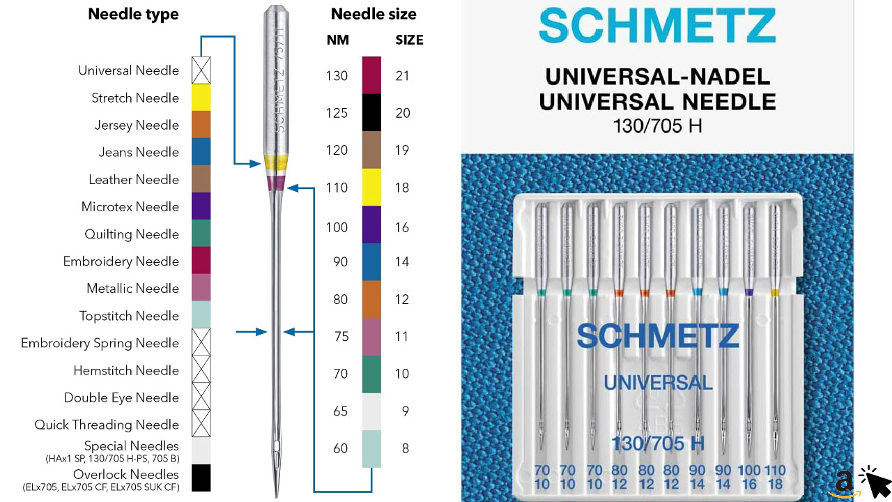 Universalnadeln, die in den Stärken 70 bis 90 erhältlich sind,kommen besonders häufig zum Einsatz. Eine Nadel mit der Stärke 70eignet sich für feine Stoffe wie etwa Batist und Seide am besten,während mittlere Stoffe (Baumwolle, Tuch) mit der Nadelstärke 80und schwere Stoffe (Cord, Tweed) mit der Nadelstärke 90verarbeitet werden.